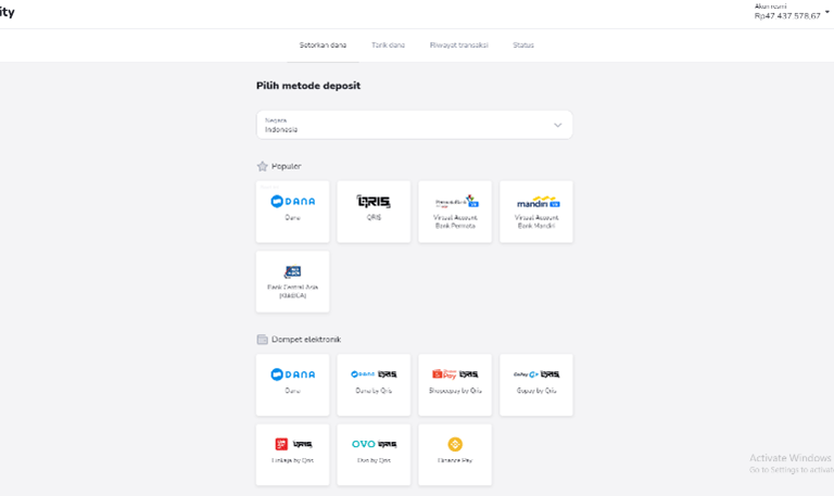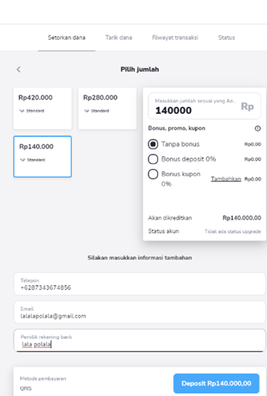 2) Kemudian pilih Anda ingin deposit melalu rekening atau Dana,QRIS dsb Disini ambil contoh deposit melalui QRIS