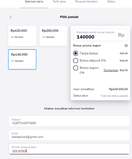 3) Isi formulir dengan masukan nominal yang ingin Anda deposi